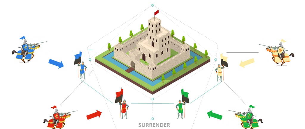 The generals connect via messenger in order to agree to a joint plan of action in which all battalions coordinate and attack from all sides in order to achieve success.